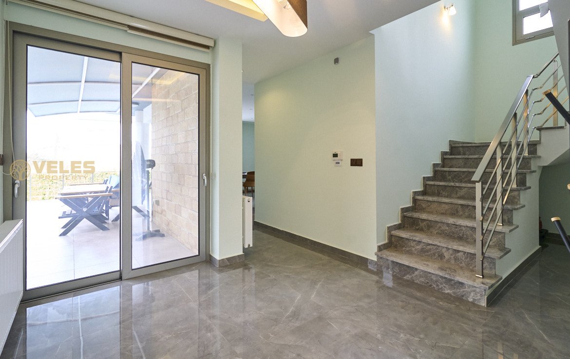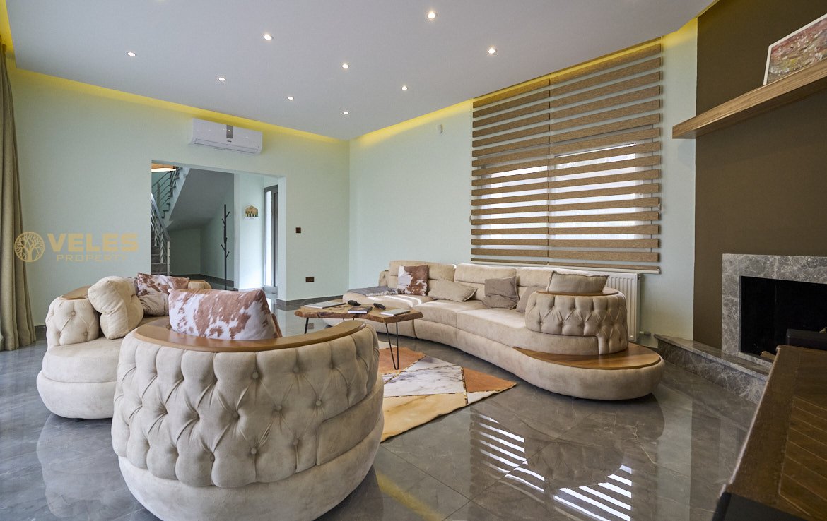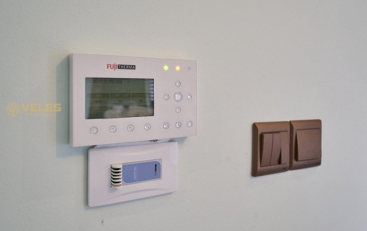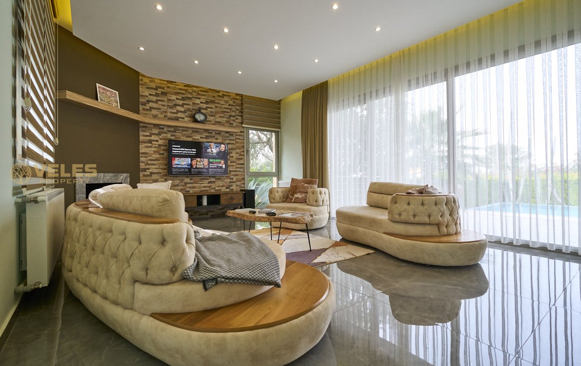 Вилла включает 3 спальни, 3 ванные комнаты, просторную гостиную с камином, отдельную кухню со встроенной мебелью и террасу с выходом к бассейну 10×5 м. Установлены тёплые полы, тепловой насос и солнечные панели. На территории есть парковка на 3 автомобиля.